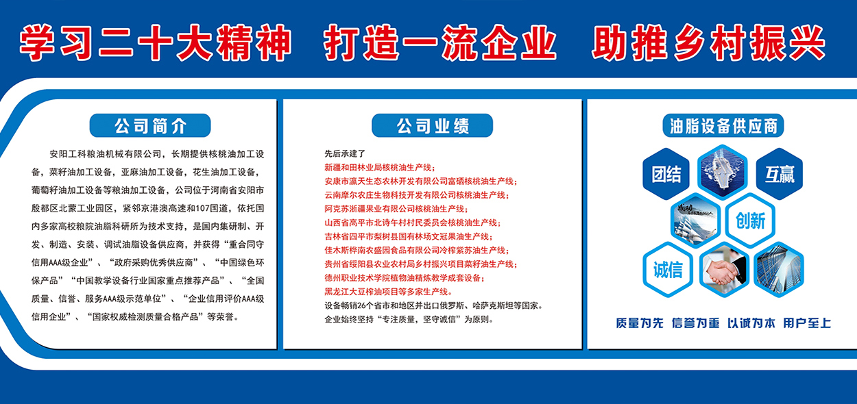 安陽工科糧油機械有限公司,長期提供核桃油加工設備,茶籽油加工設備,菜籽油加工設備,亞麻油加工設備,花生油加工設備,葡萄籽油加工設備等糧油加工設備,公司位于河南省安陽市殷都區(qū)北蒙工業(yè)園區(qū),緊鄰京港澳高速和107國道,依托國內(nèi)多家高校糧院油脂科研所為技術支持,是國內(nèi)集研制、開發(fā)、制造、安裝、調試油脂設備供應商,并獲得“重合同守信用AAA級企業(yè)”、“政府采購優(yōu)秀供應商”、“中國綠色環(huán)保產(chǎn)品”“中國教學設備行業(yè)國家重點推薦產(chǎn)品”、“全國質量、信譽、服務AAA級示范單位”、“企業(yè)信用評價AAA級信用企業(yè)”、“國家權威檢測質量合格產(chǎn)品”等榮譽。先后承建了新疆和田林業(yè)...